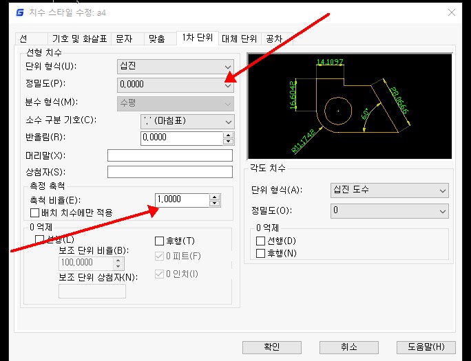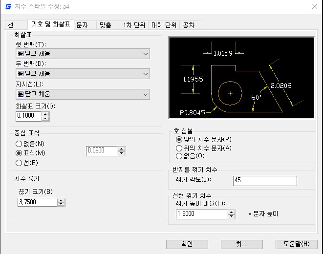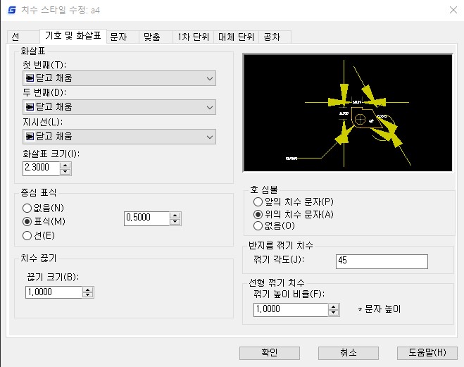 화살표 크기 : 말그대로 화살표의 크기입니다. 치수선 사이의 거리가 짧은데 화살표가 크다면 이상하겠죠?