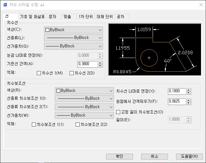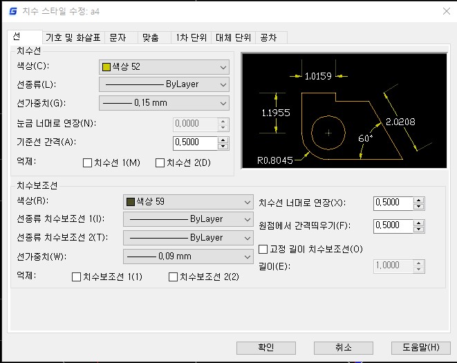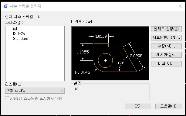 치수 스타일에 a4가 생성되었습니다. 이제 편집을 해줍니다. (저는 설명하기 위해 창을 닫았지만, 보통 새로이름을 바꾸면, 바로 설정창이 나타납니다.)