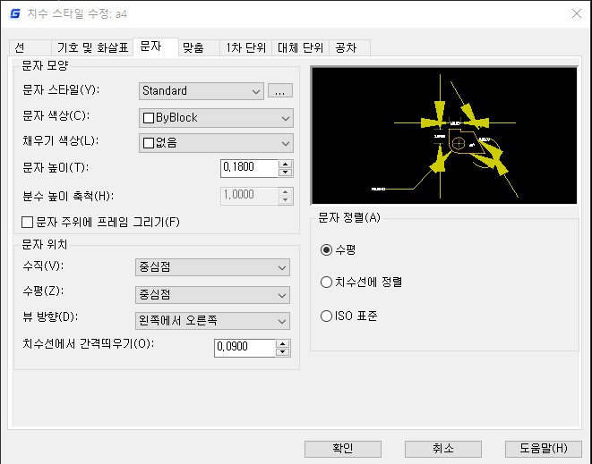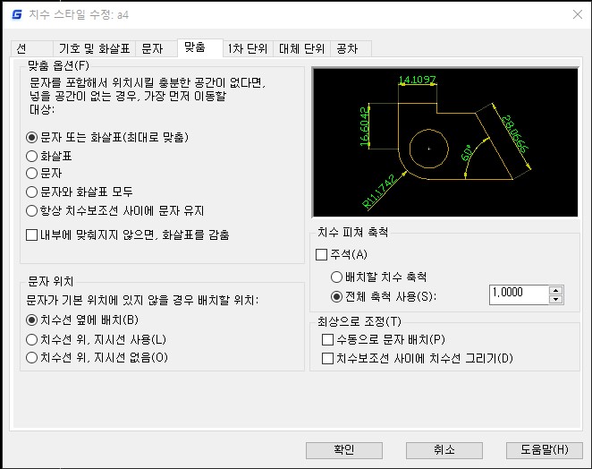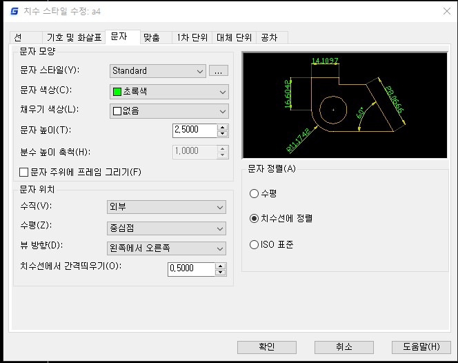 이곳에선 문자위치를 치수선 위, 지시선 사용으로 바꿔줍니다.