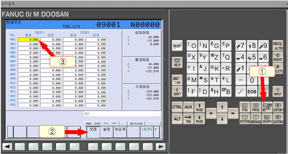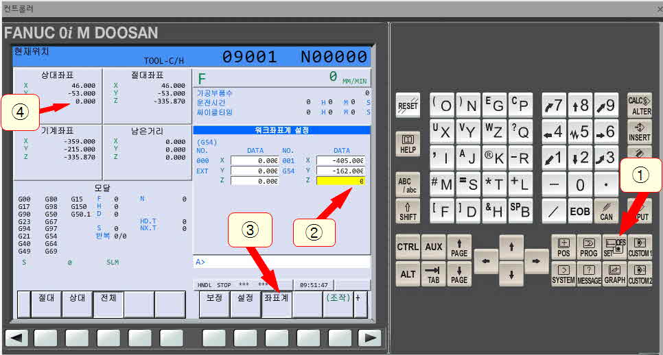 3번의 "0"의 값을 직접 패널에서 "0" input을 눌러주시면 됩니다. 하지만 근래의 대부분의 머시닝 센터에서는 축의 값을 입력하면 "C입력"이라는 메뉴가 생성되는데, 이 "C입력"을 눌렀을 경우 상대좌표의 값이 해당 란에 반영됩니다.