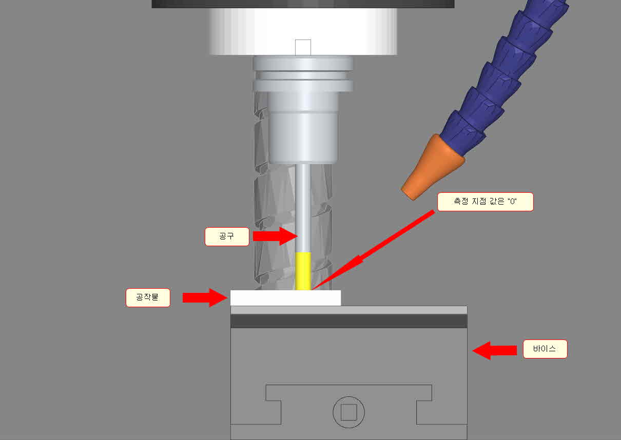 하지만, 만약 공작물의 두께가 바뀌었다면, 해당 공구의 길이보정 또한 다시해 주어야 합니다. 한개의 공구라면, 크게 무리가 없겠지만, 만약 10개의 공구가 있다고 한다면, 그 10개의 공구 모두를 공작물 상면에 보정 측정하여 옵셋값을 매번 공작물이 바뀔때마다 측정한다는것은 매우 불편할 것입니다.