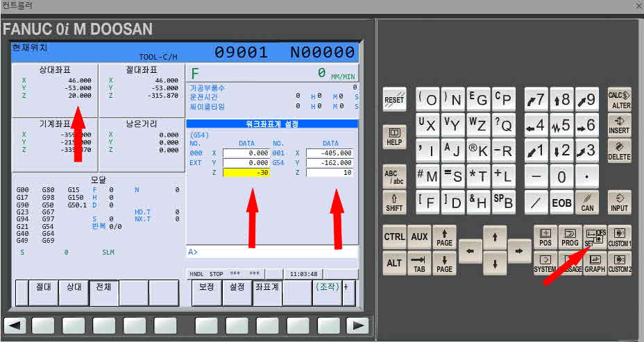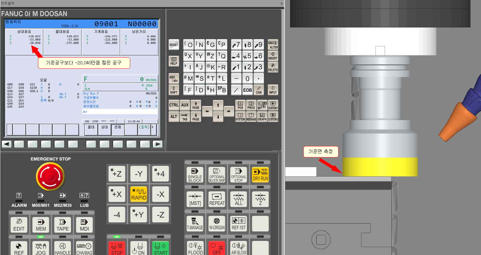보정된 값을보면, 기준공구보다 -20.040의 값이(상대좌표계값)이 대입된것을 볼수있습니다.