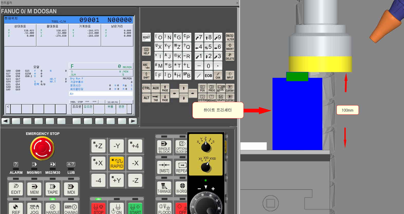 위그림에서 상대좌표계의 값은 "0"입니다. 하지만, 실제로 기준면인 바이스 상면은 현재보다 하이트 프리세터 두께만큼 올라가 있는것이죠. 이부분 때문에 공구 길이 보정 옵셋값에 매번 -100(프리세터두께)만큼 더 내려줘야하는데 이때, "+입력"을 사용합니다.
