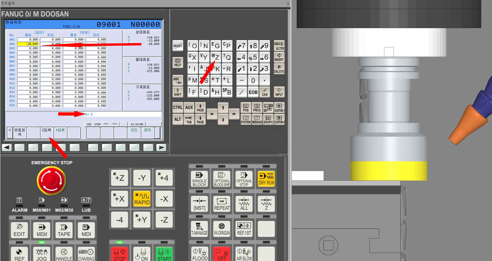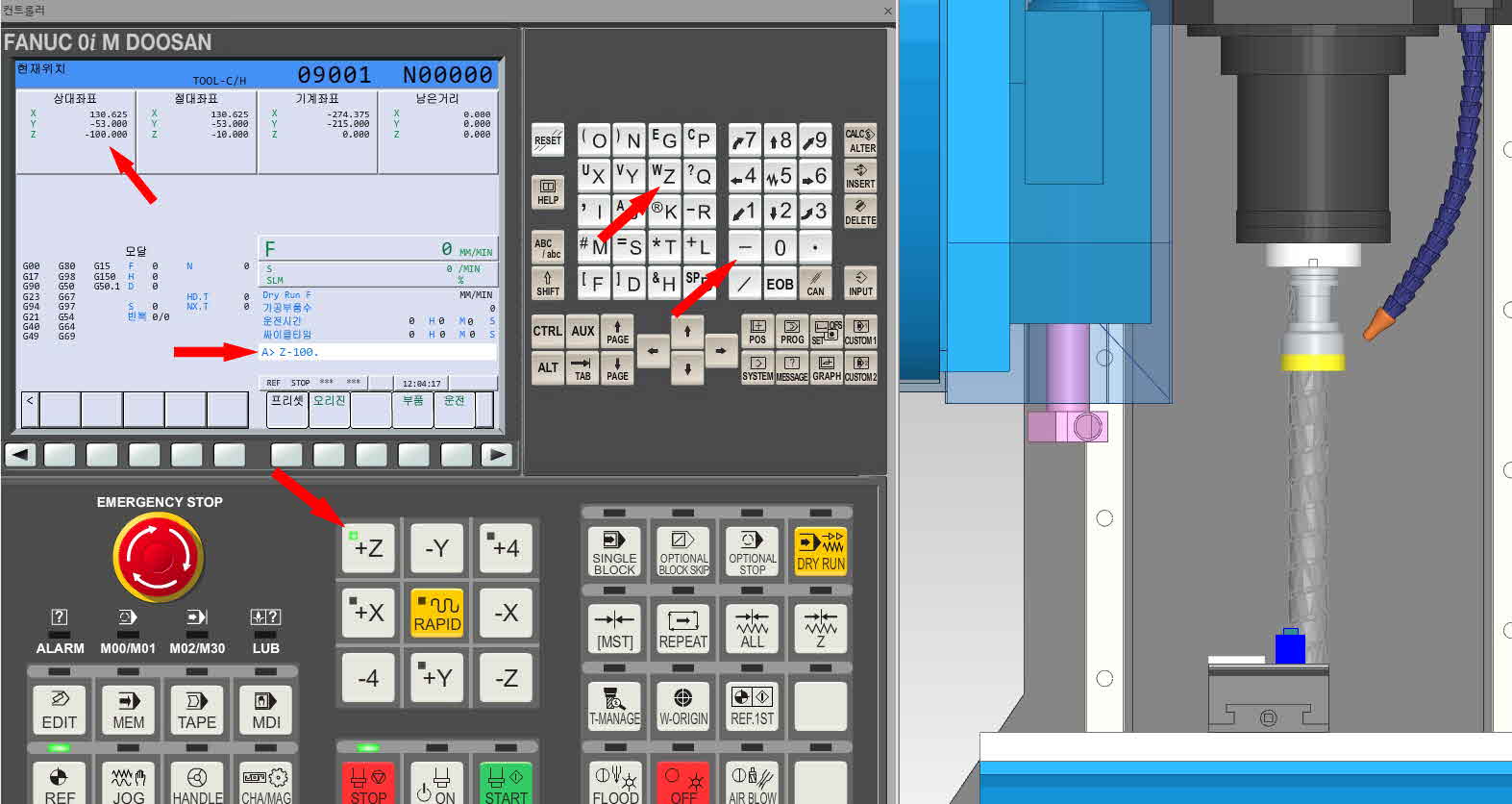 위그림과 같이 Z원점인 상태에서 미리 -100. 이란 값을 내려버리면, 공구 옵셋 보정값에 매번 "-100.을 +입력해주지 않아도 된다"는 것이죠.
