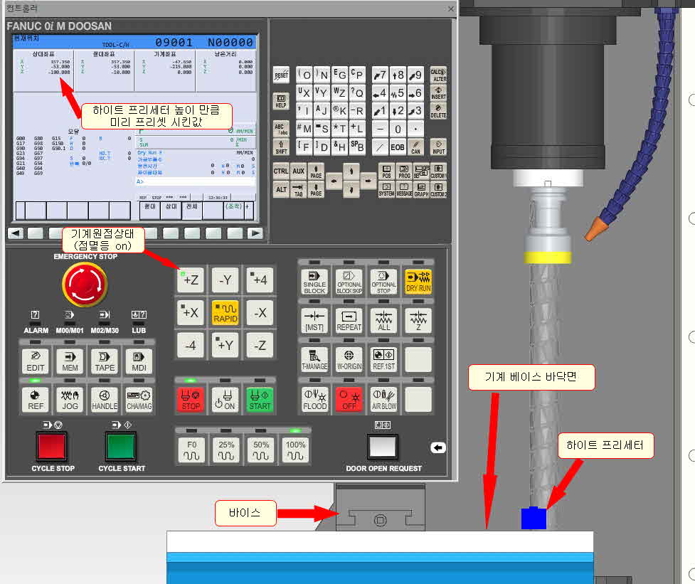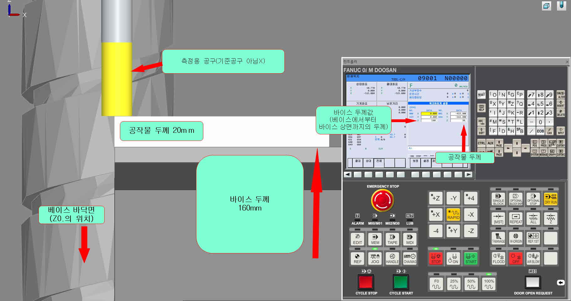 이번에 알아볼것은 공구 길이보정과 함께 알아두셔야할 기본계념중 워크좌표계의 세팅에 대해 알아보겠습니다. 먼저 어떠한 좌표이던간에 알아보기 쉬운것이 사고 위험도 적다. 라는 것을 염두해 두시면 좋을것 같습니다. 이 워크좌표계에서 밑줄 친 1번의 좌표계를 보면, NO. 000 EXT 라고 좌표계 옆에 명시되어 있습니다. 이 EXT는 EXTEND(확장) 좌표계로 알고 있으며, 해당란에 들어 있는 숫자는 그옆에 또는 다음 페이지에서 지정할수 있는 좌표계 (G54),(G55),(G56) ...... 이런 각각의 좌표들에 영향을 미칠수 있는 좌표값 입니다. 예를들어, 확장 좌표계 X값이 +10, G54 X값이 +10, 이라고 한다면, 실제 가공되는 좌표계는 X20. 의 좌표에서 작업을 하게됩니다.(다른좌표계도 마찬..